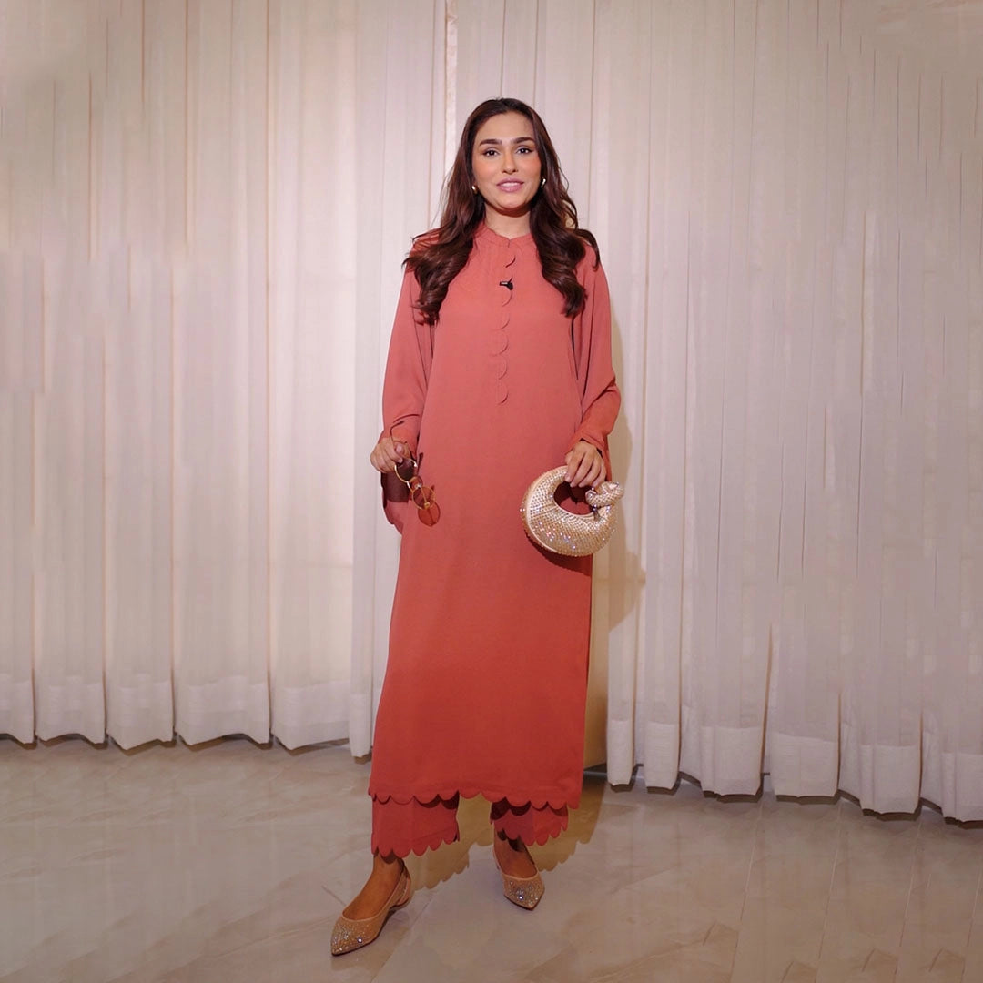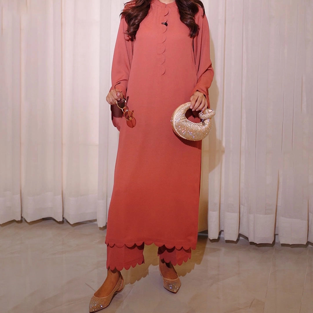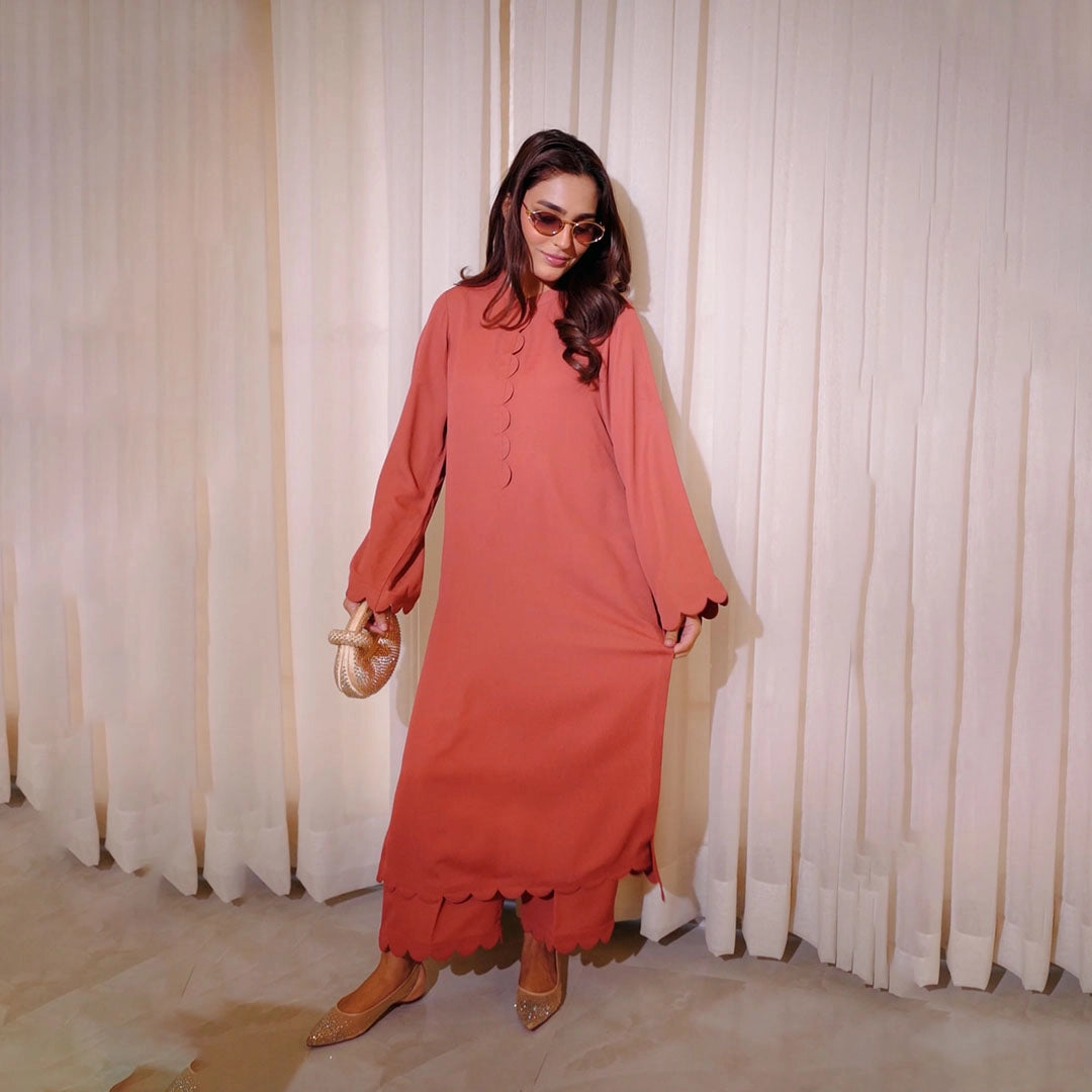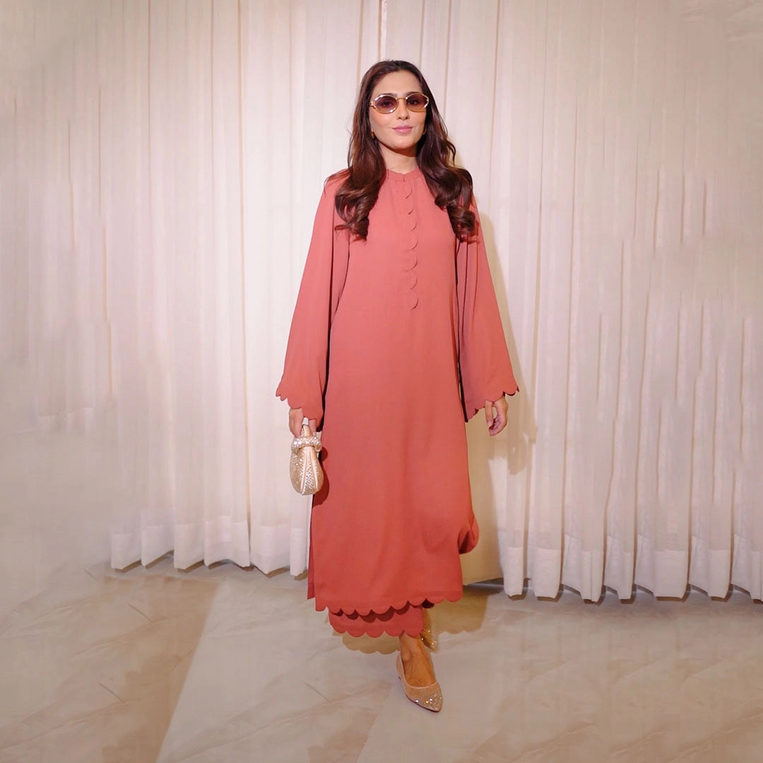 Design: Long straight kurta with scalloped edges on sleeves and hemline for a feminine, graceful touch.