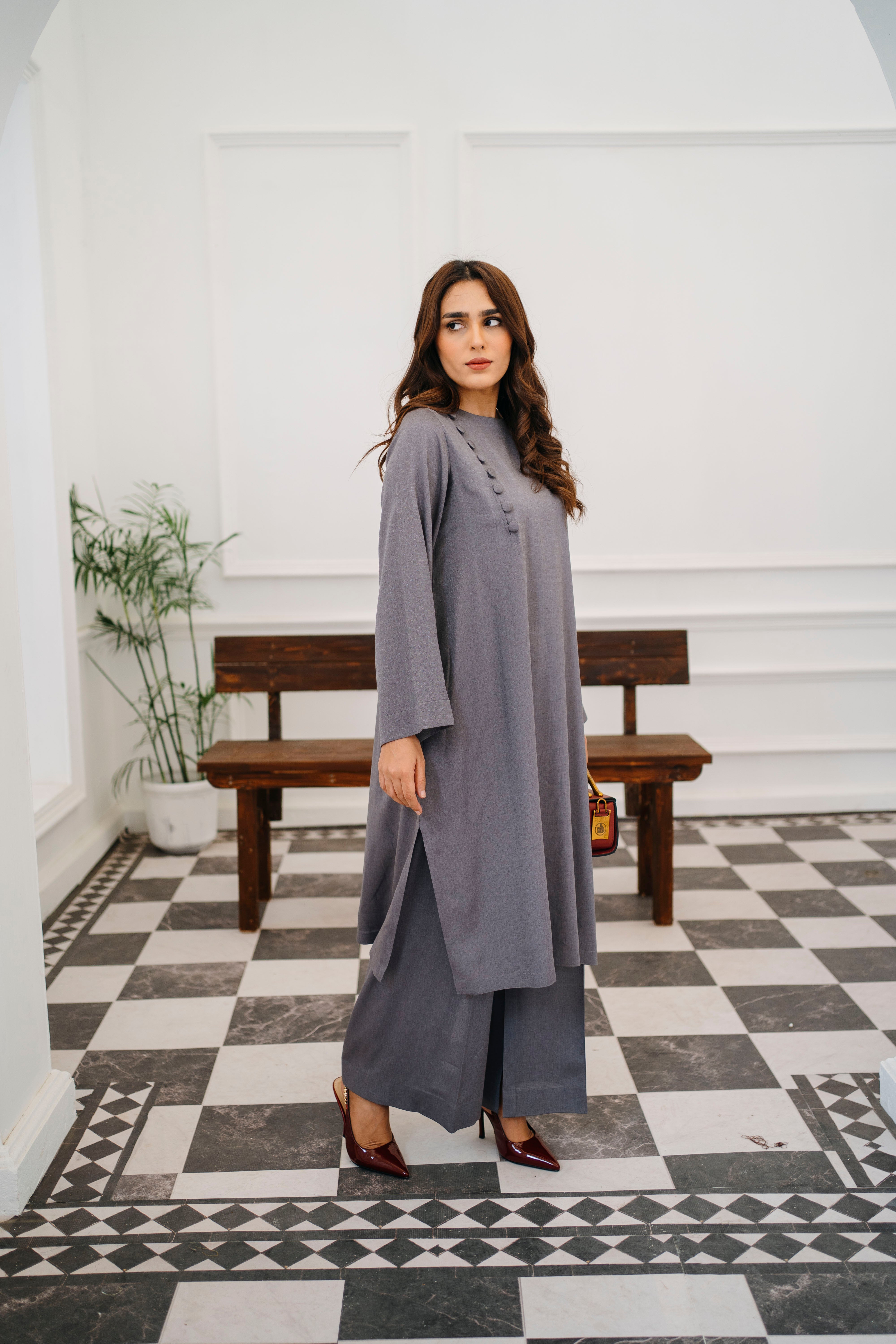 Shirt Design: Long straight-cut kurta with side slits and minimal structure
