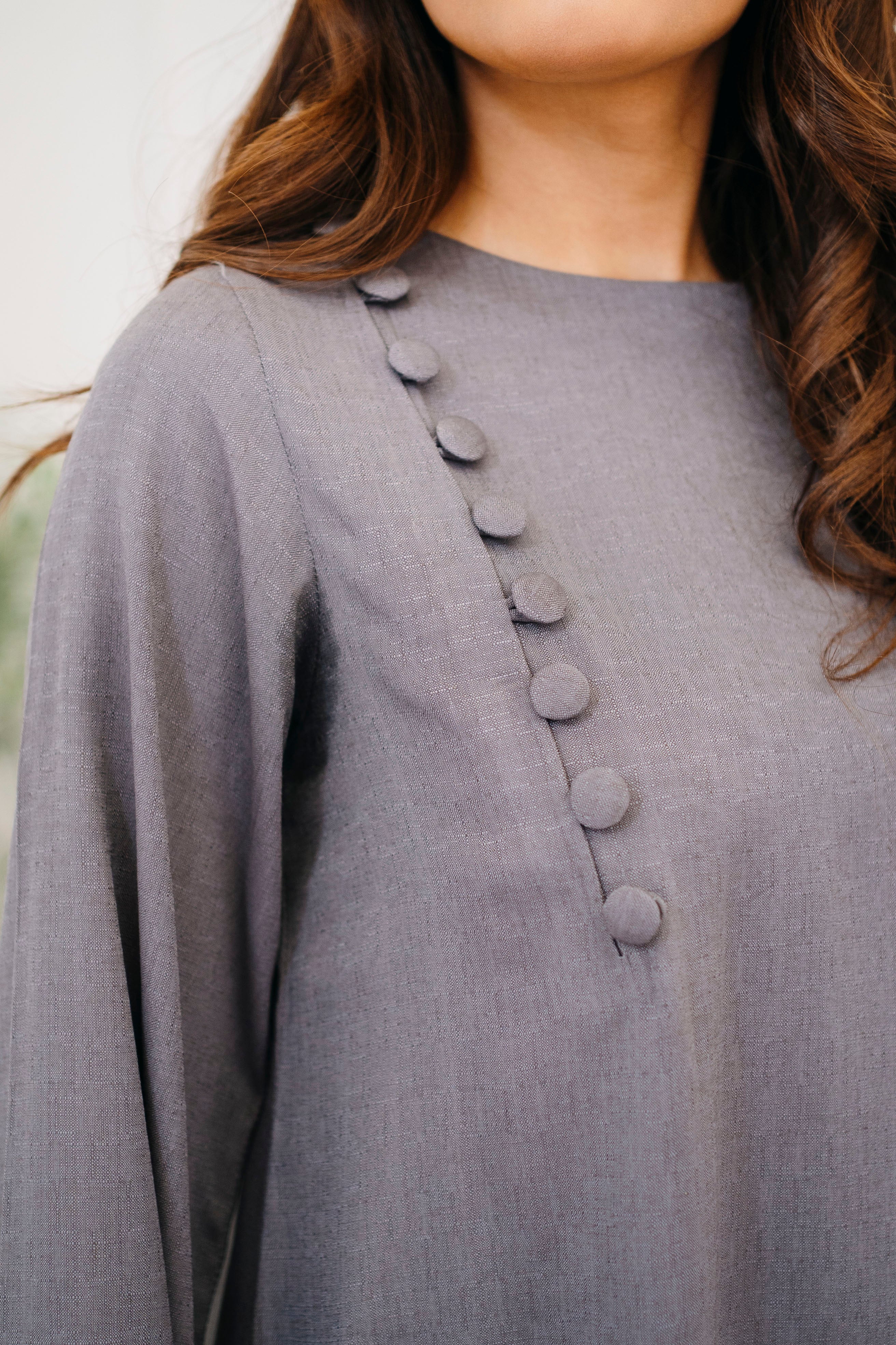 Neckline: Round neckline with asymmetric fabric-covered button detailing