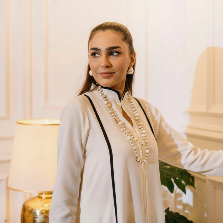 Sleeves: Full-length straight sleeves with black-trimmed edges for a polished monochrome effect