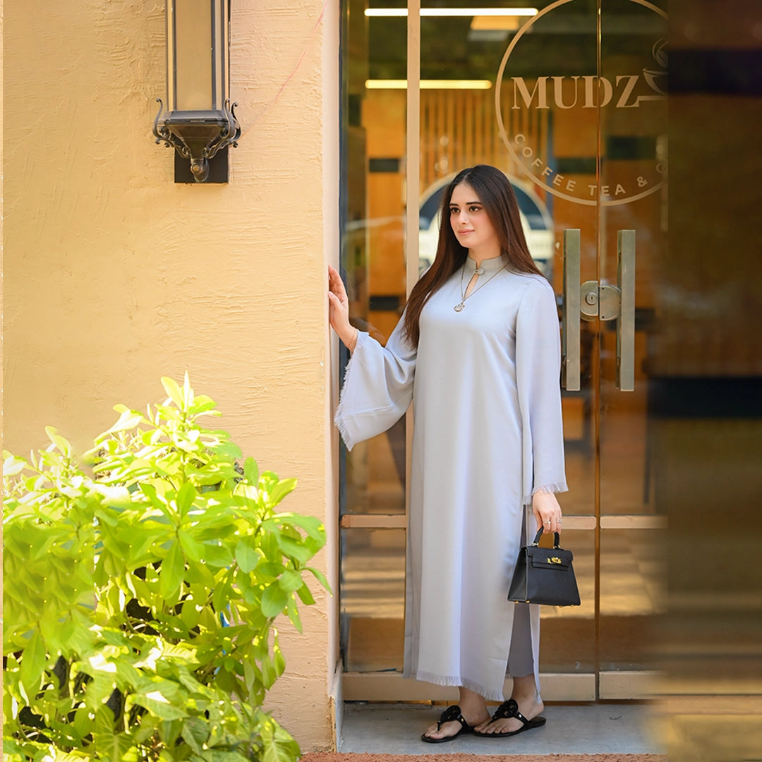 Tailored from wrinkle-free China crepe, this elegant grey ensemble exudes quiet sophistication made for women who prefer grace over glamour.
