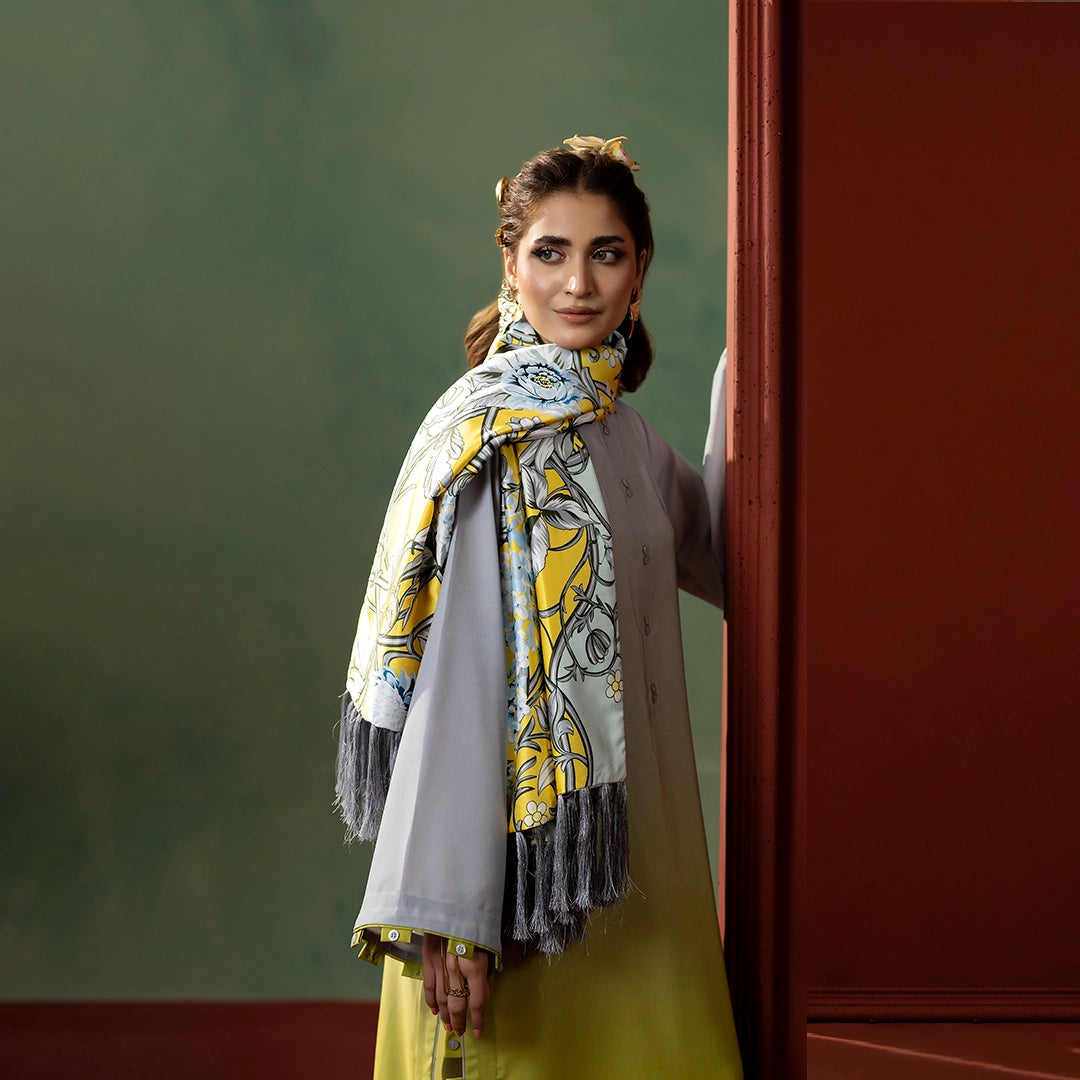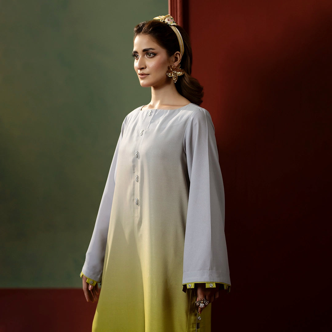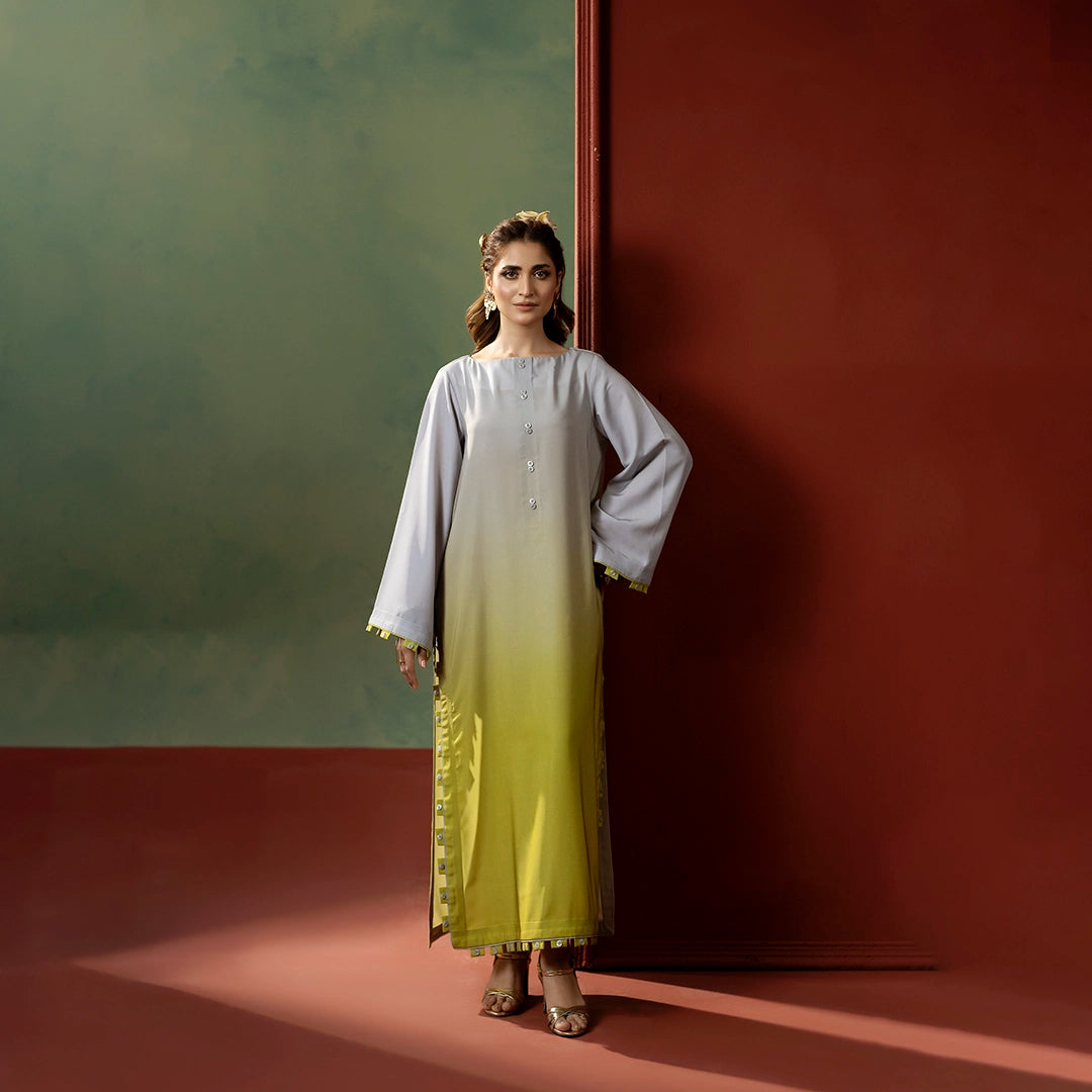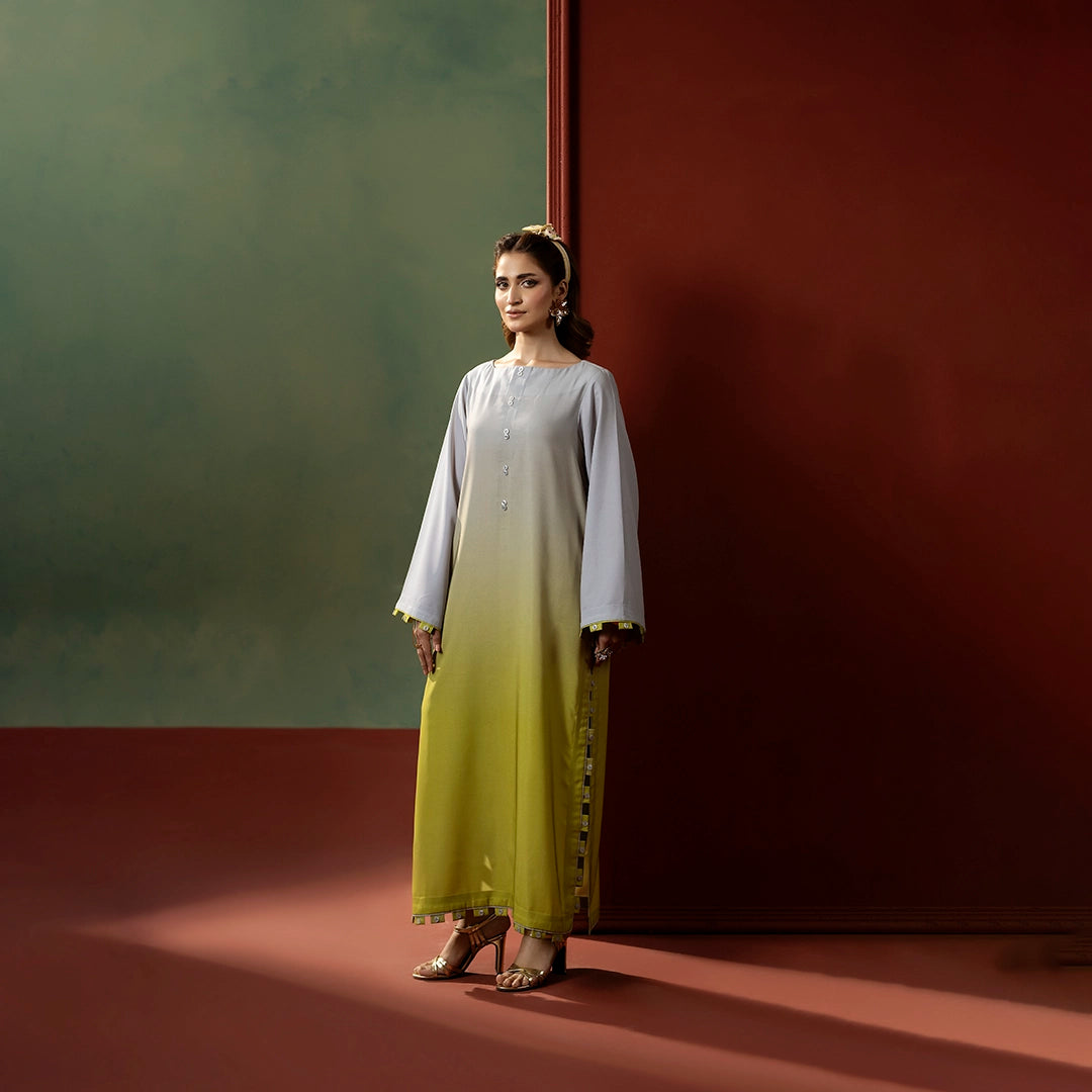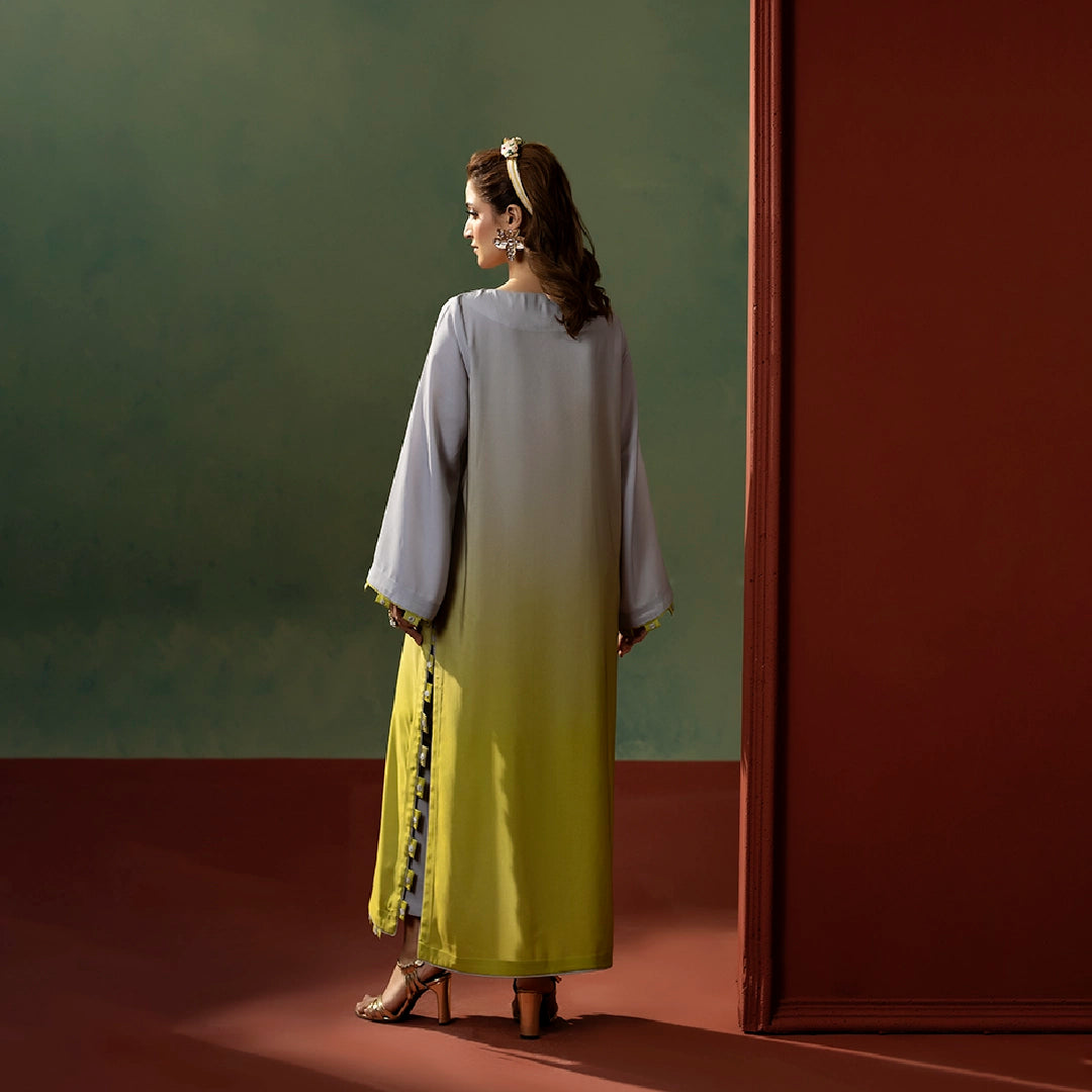A contemporary ombre silhouette blending soft silver tones into a fresh lime hue, creating a graceful color transition that feels both minimal and statement-making.